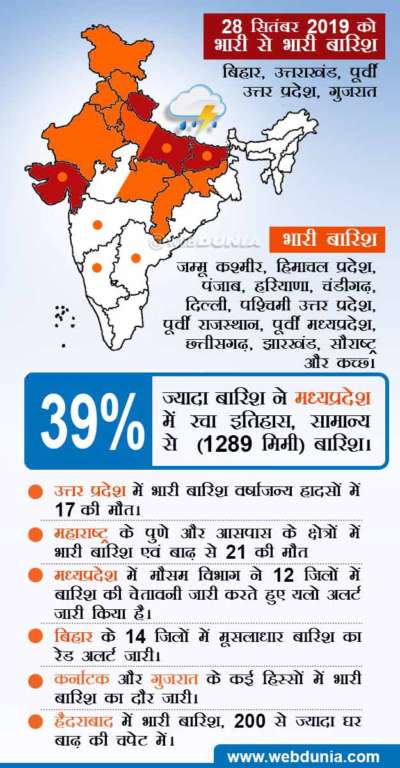 देशभर में बारिश का कहर थमने का नाम ही नहीं ले रहा है। मौसम विभाग ने कहीं रेड अलर्ट जारी किया है तो कही ऑरेंज अलर्ट। दक्षिण पश्चिम मानसून विदाई लेने जा रहा है लेकिन फिर भी यूपी, बिहार, गुजरात, मध्यप्रदेश, महराष्ट्र, तेलंगाना समेत देश के कई हिस्सों में भारी बारिश का कहर जारी है। मौसम विभाग का अनुमान बारिश से नवरात्रि में भी राहत नहीं मिलेगी और दशहरे तक मौसम खुलने के आसार नजर नहीं आ रहे हैं।